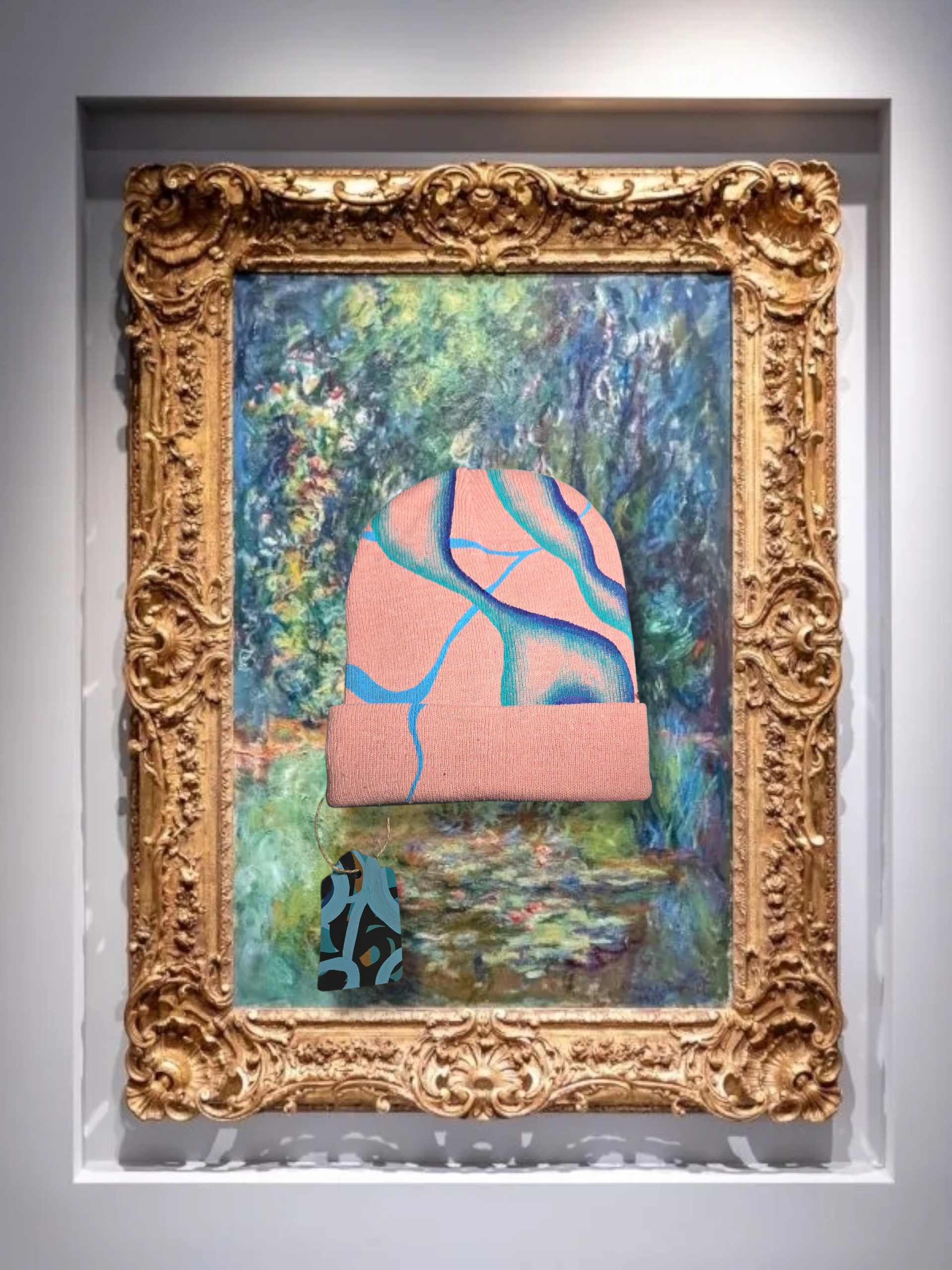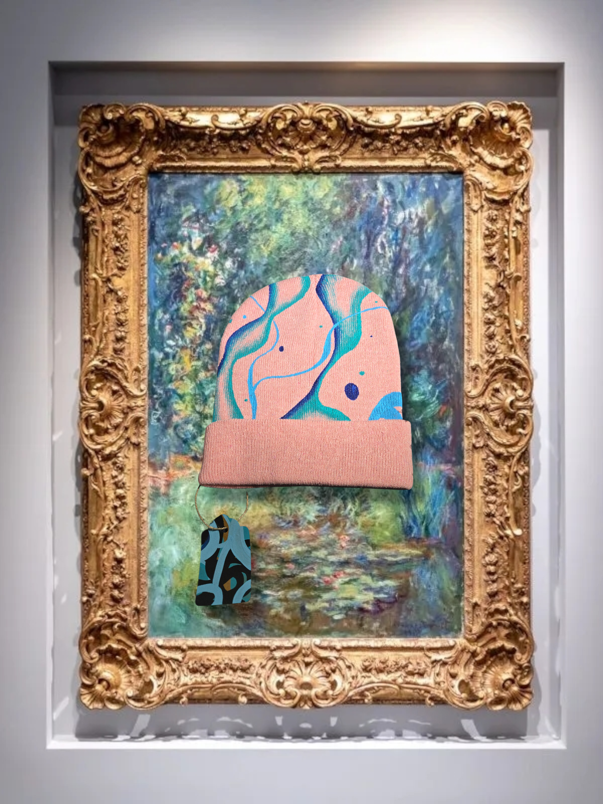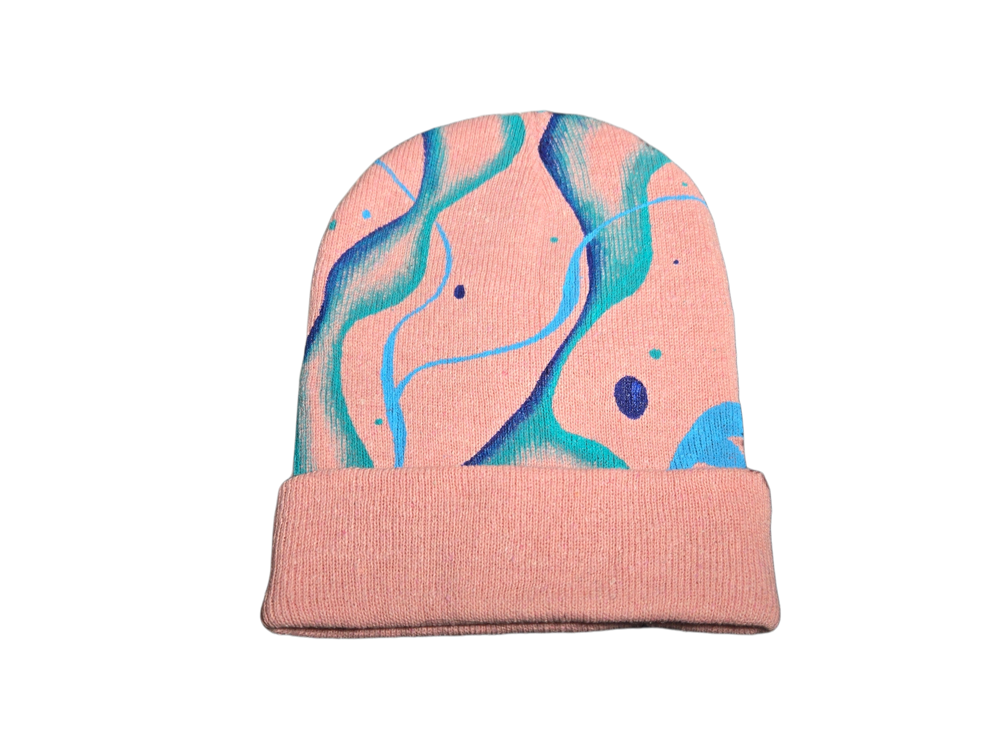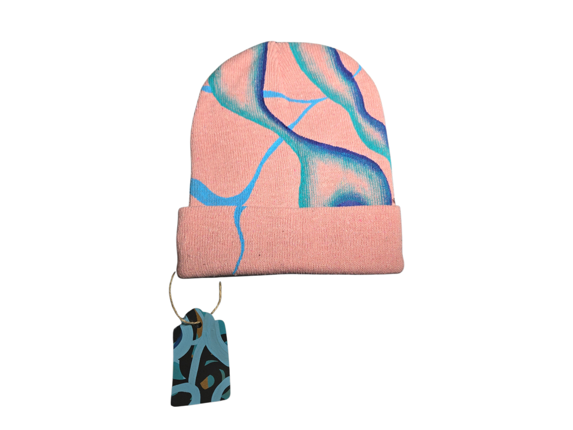 Vibrant abstract art painted beanie design with hues of blue and pink intertwined with minimum design on brim, front and back designs shown.