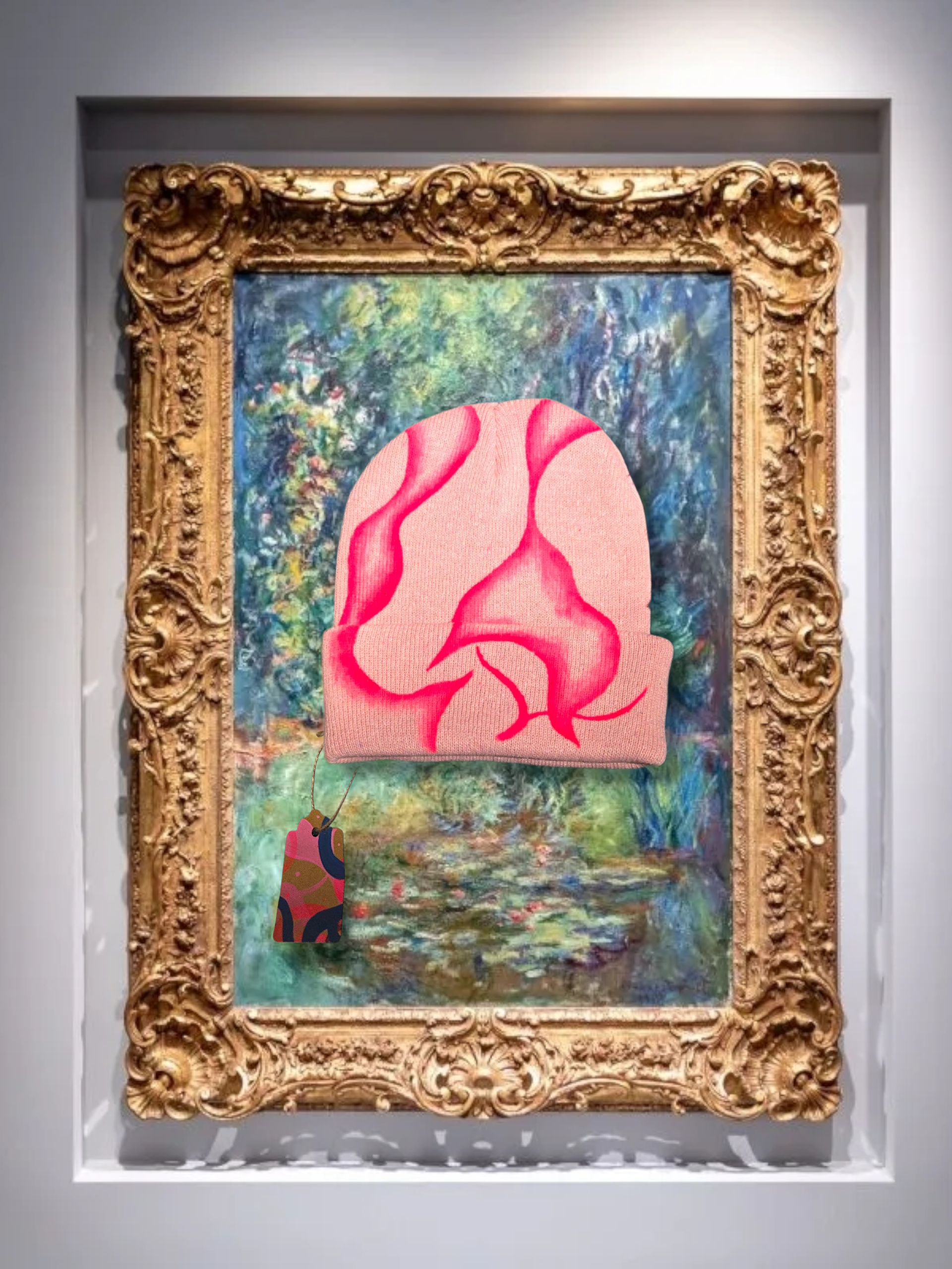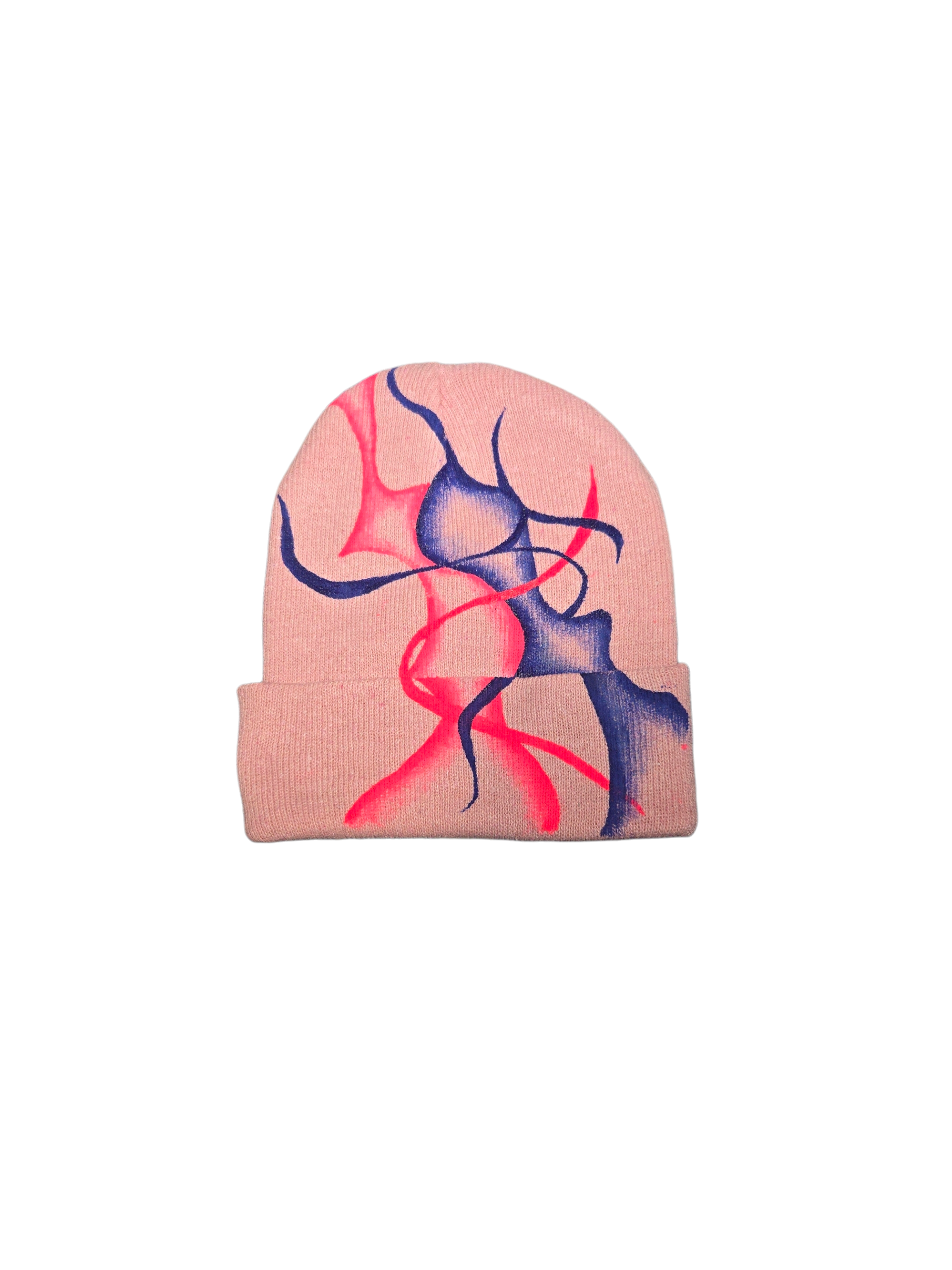 Vibrant pink abstract art painted beanie hat- Double sided design with intertwine of pink and deep purple for a great contrast in style.